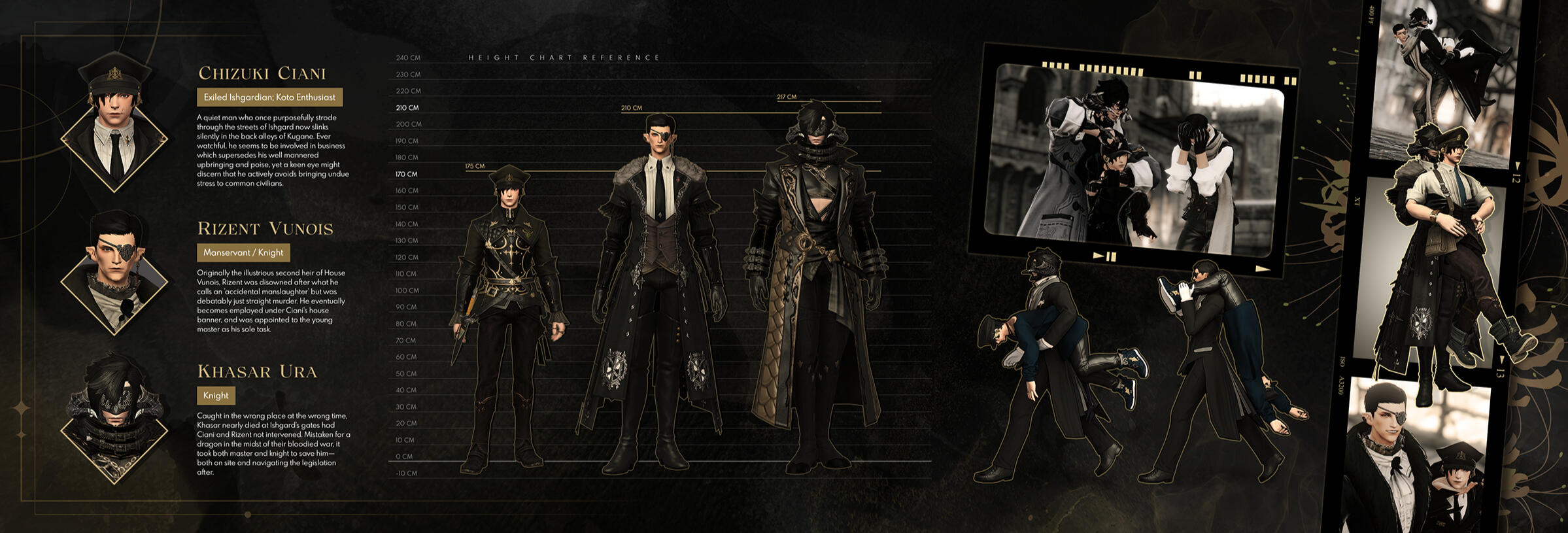 A quiet man    who once purposefully strode through the streets of Ishgard now slinks silently in the back alleys of Kugane. Ever watchful, he seems to be involved in business which supersedes his well mannered upbringing and poise, yet a keen eye might discern that he actively avoids bringing undue stress to common civilians.